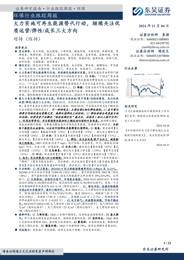 【东吴证券】【20241104】环保行业跟踪周报:大力实施可再生能源替代行动,继续关注优质运营弹性成长三大方向-22页