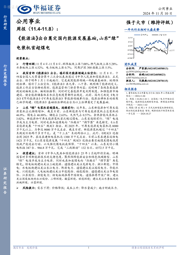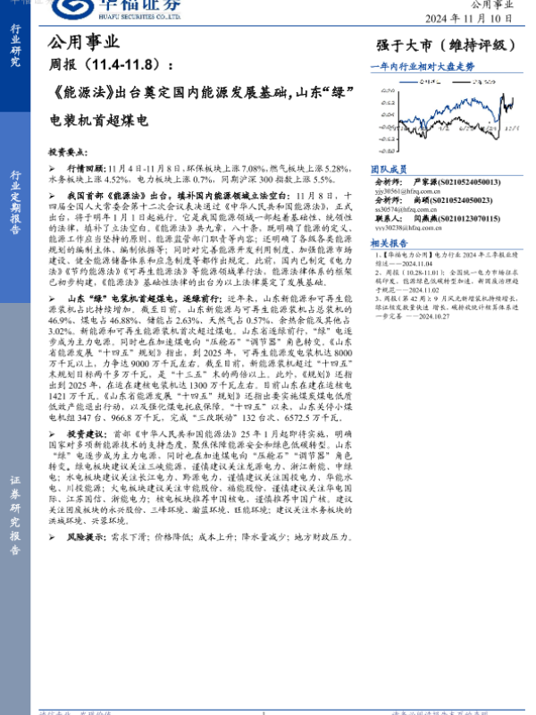 【华福证券】【20241110】公用事业周报:《能源法》出台奠定国内能源发展基础,山东“绿”电装机首超煤电-18页
