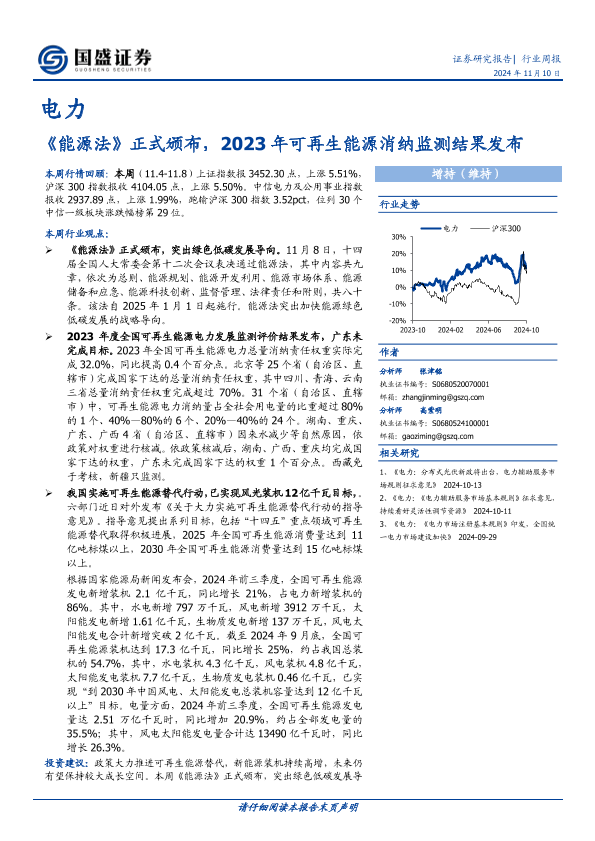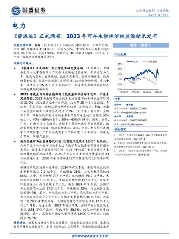 【国盛证券】【20241110】电力行业周报:《能源法》正式颁布,2023年可再生能源消纳监测结果发布-16页