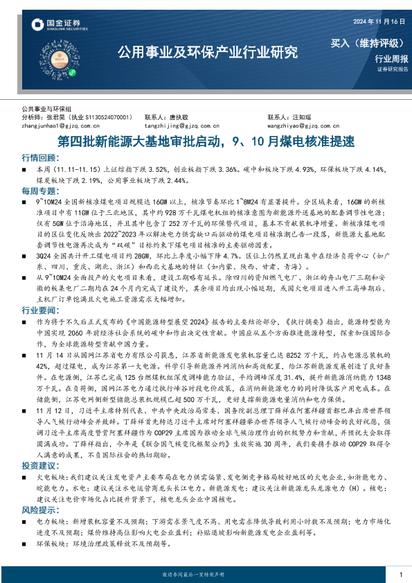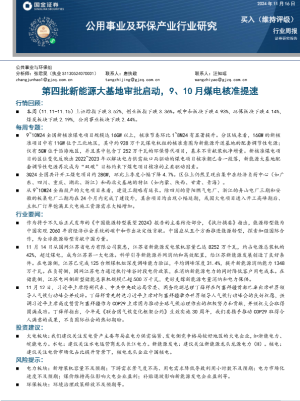 【国金证券】【20241116】公用事业及环保产业行业研究:第四批新能源大基地审批启动,9、10月煤电核准提速-16页
