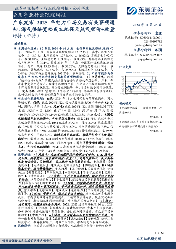 【东吴证券】【20241125】公用事业行业跟踪周报:广东发布2025年电力市场交易有关事项通知,海气供给宽松成本端促天然气顺价+放量-22页