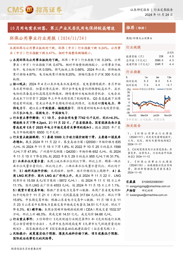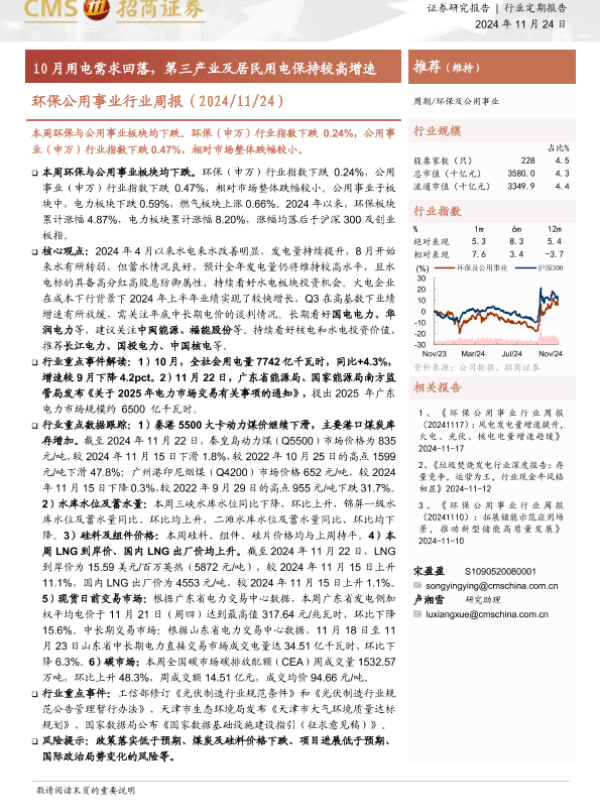 【海通证券】【20241124】环保公用事业行业周报:10月用电需求回落,第三产业及居民用电保持较高增速-21页