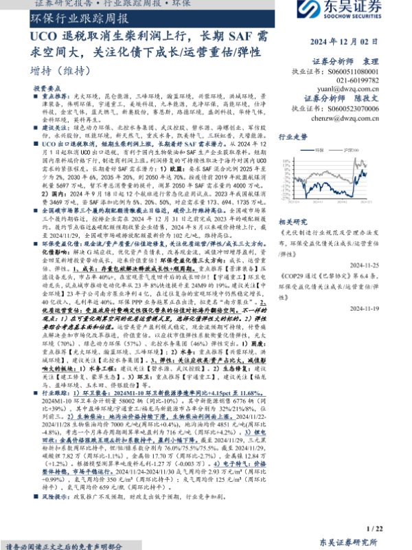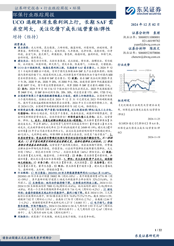 【东吴证券】【20241202】环保行业跟踪周报:UCO退税取消生柴利润上行,长期SAF需求空间大,关注化债下成长运营重估弹性-22页