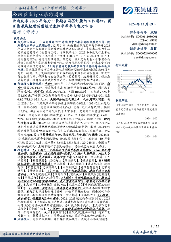 【东吴证券】【20241209】公用事业行业跟踪周报:云南发布2025年电力中长期合同签订履约工作通知,国家能源局鼓励新型经营主体平等参与电力市场-22页