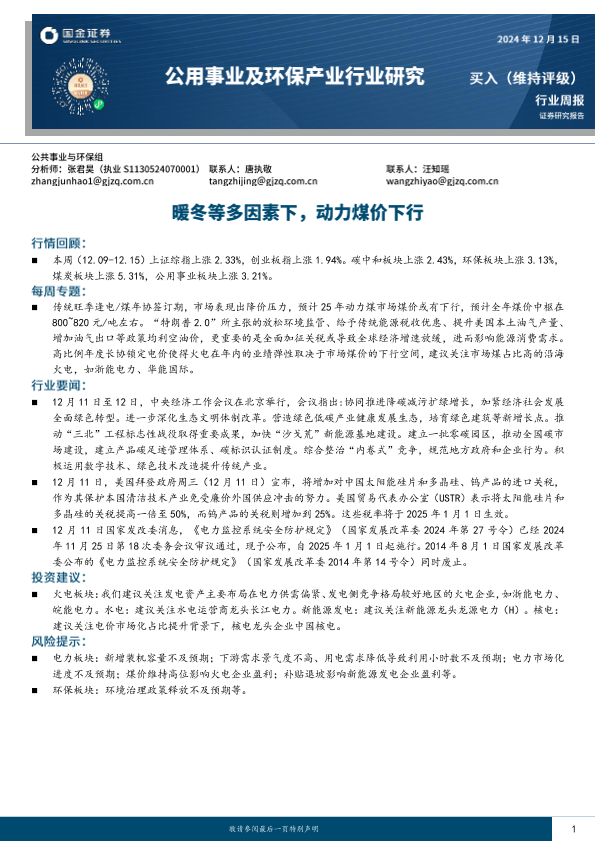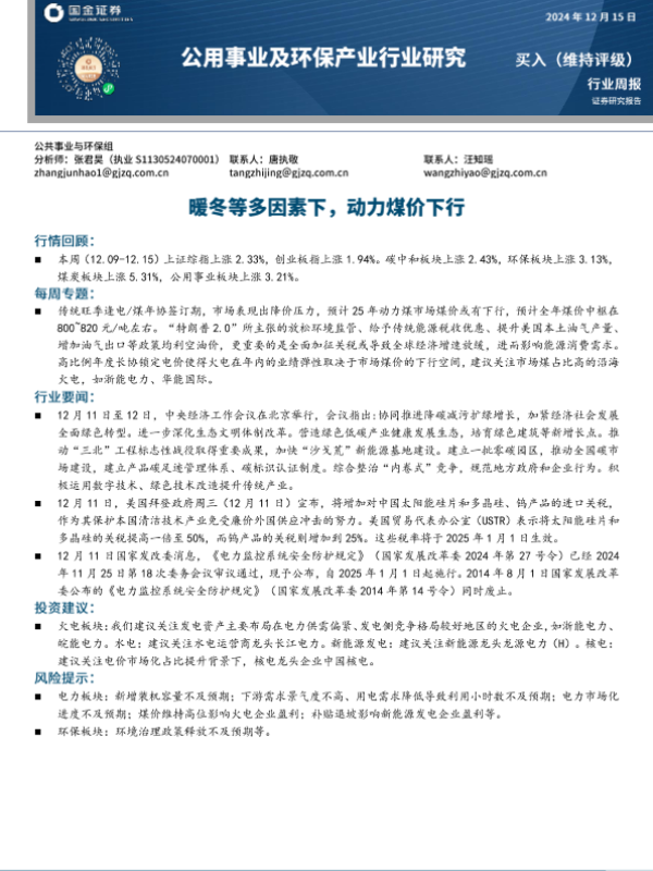 【国金证券】【20241215】公用事业及环保产业行业研究:暖冬等多因素下,动力煤价下行-15页