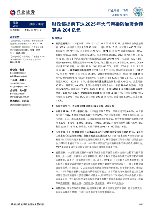 【兴业证券】【20241221】环保行业周报:财政部提前下达2025年大气污染防治资金预算共204亿元-10页
