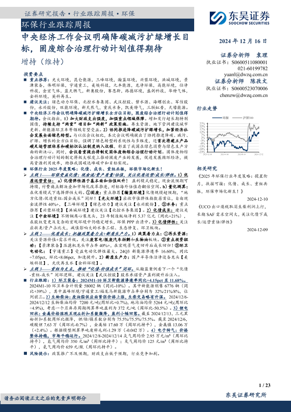 【东吴证券】【20241216】环保行业跟踪周报:中央经济工作会议明确降碳减污扩绿增长目标,固废综合治理行动计划值得期待-23页