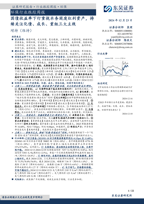 【东吴证券】【20241223】环保行业跟踪周报:国债收益率下行重视水务固废红利资产,持续关注化债、成长、重组三大主线-22页