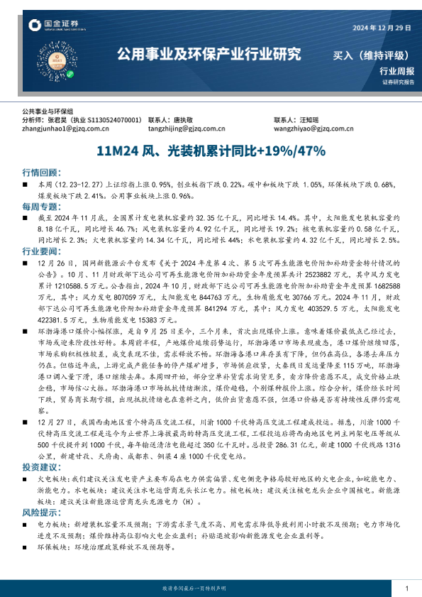 【国金证券】【20241229】公用事业及环保产业行业研究周报-16页