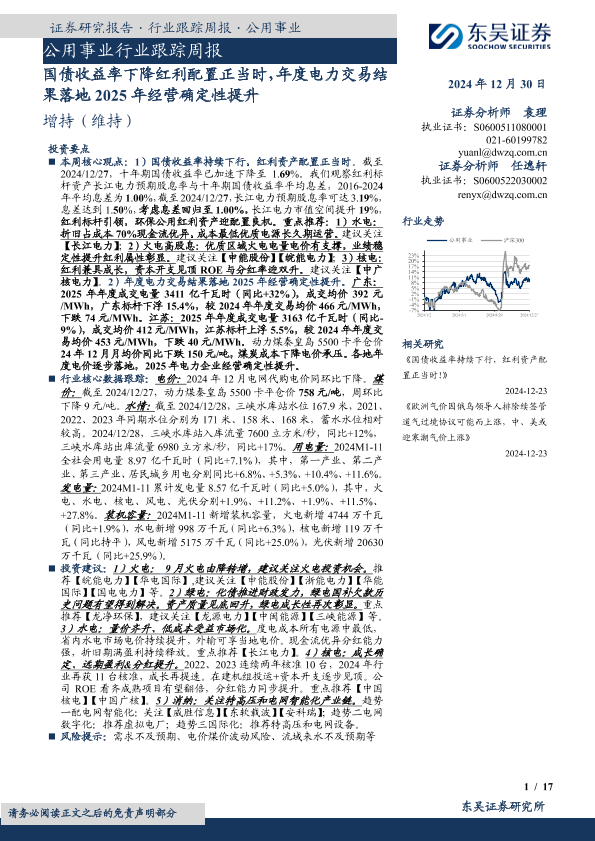 【东吴证券】【20241230】公用事业行业跟踪周报:国债收益率下降红利配置正当时,年度电力交易结果落地2025年经营确定性提升-17页