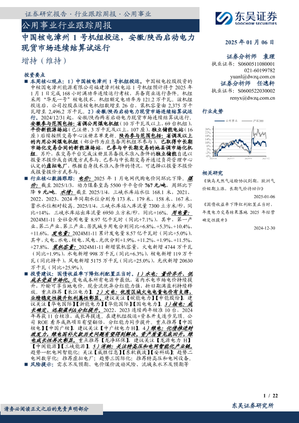 【东吴证券】【20250106】公用事业行业跟踪周报:中国核电漳州1号机组投运,安徽陕西启动电力现货市场连续结算试运行-22页