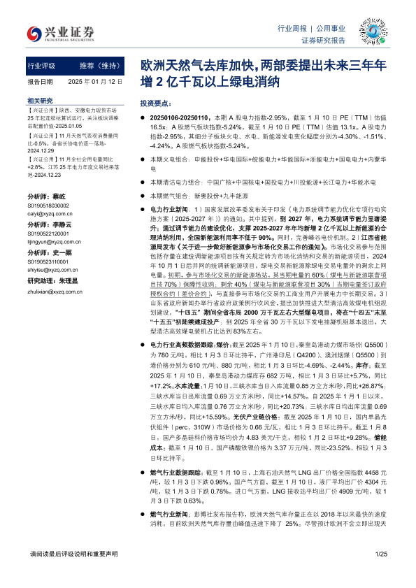 【兴业证券】【20250112】欧洲天然气去库加快,两部委提出未来三年年增2亿千瓦以上绿电消纳-25页