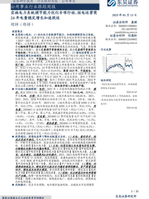 【东吴证券】【20250113】实施电力系统调节能力优化专项行动,核电运营商24年电量稳定增长加速投运-21页
