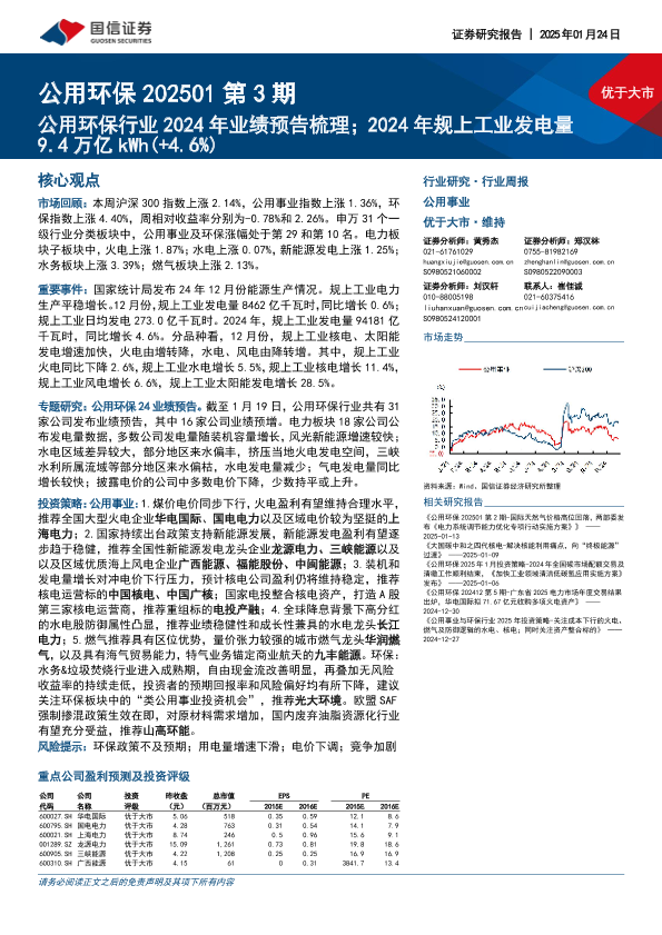 【国信证券】【20250124】公用环保行业2024年业绩预告梳理;2024年规上工业发电量9.4万亿kWh(+4.6%)-30页