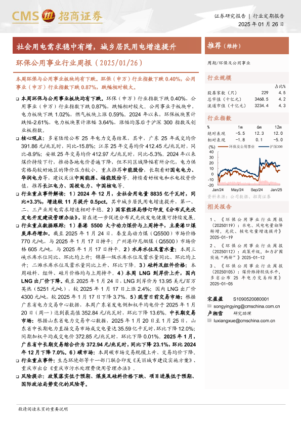 分布式光伏 城乡居民用电 煤炭价格 环保公用事业 电力交易