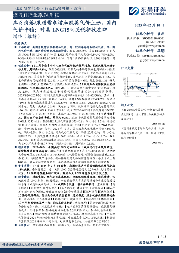 【东吴证券】【20250210】燃气Ⅱ行业跟踪周报:库存消落 采暖需求增加欧美气价上涨、国内气价平稳-13页