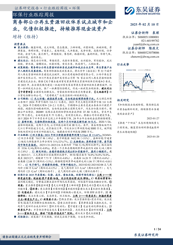【东吴证券】【20250210】环保行业跟踪周报:商务部公示再生资源回收体系试点城市和企业,化债积极推进,持续推荐现金流资产-24页