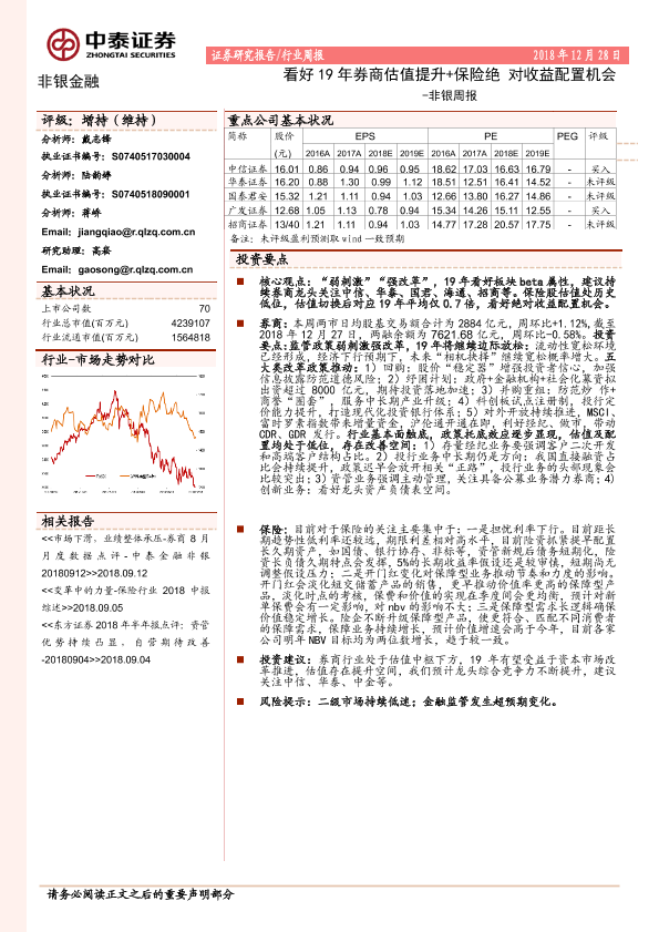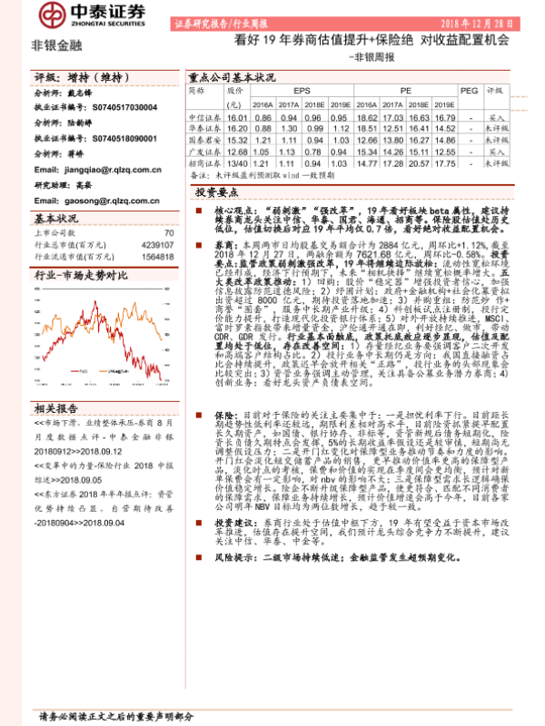 【中泰证券】【20181228】看好19年券商估值提升+保险绝对收益配置机会-17页