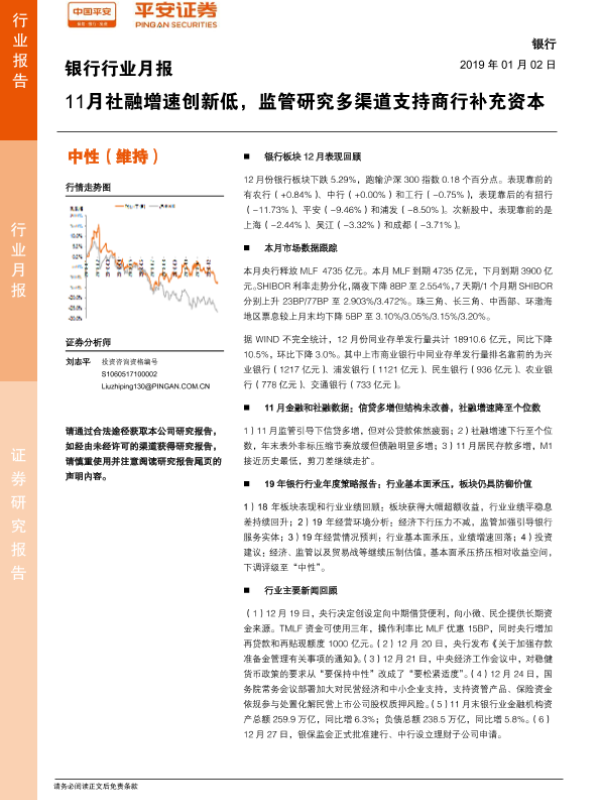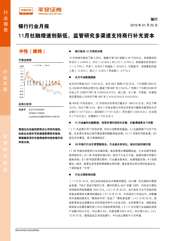 【平安证券】【20190102】银行行业月报:11月社融增速创新低,监管研究多渠道支持商行补充资本-20页