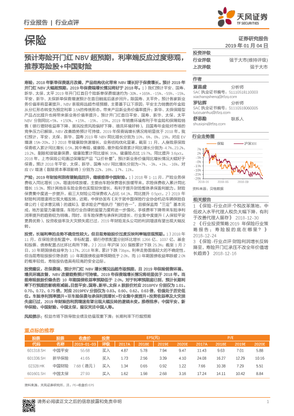 【天风证券】【20190104】预计寿险开门红NBV超预期,利率端反应过度悲观,推荐寿险股+中国财险-8页