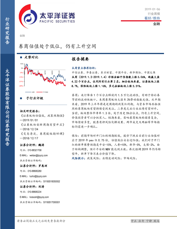 【太平洋证券】【20190106】金融行业周报:券商估值处于低位,仍有上升空间-13页