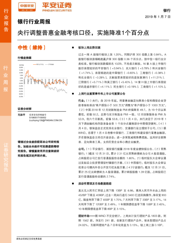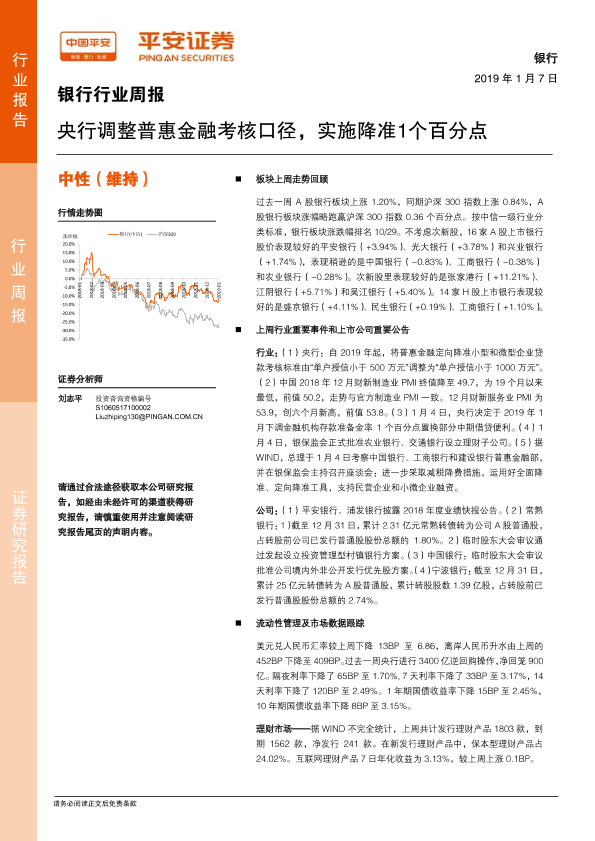 【平安证券】【20190107】银行行业周报:央行调整普惠金融考核口径,实施降准1个百分点-14页