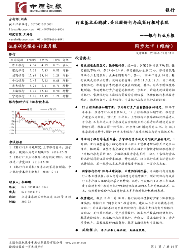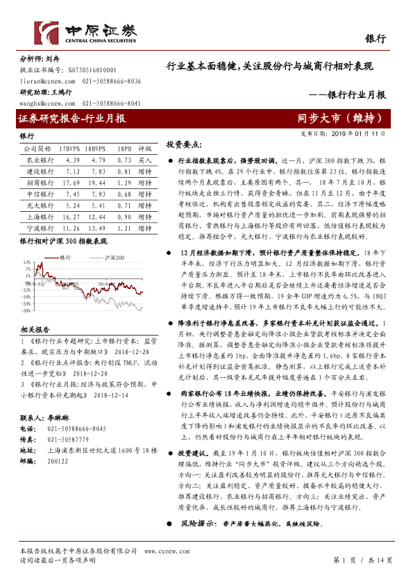 【中原证券】【20190111】银行行业月报:行业基本面稳健,关注股份行与城商行相对表现-14页