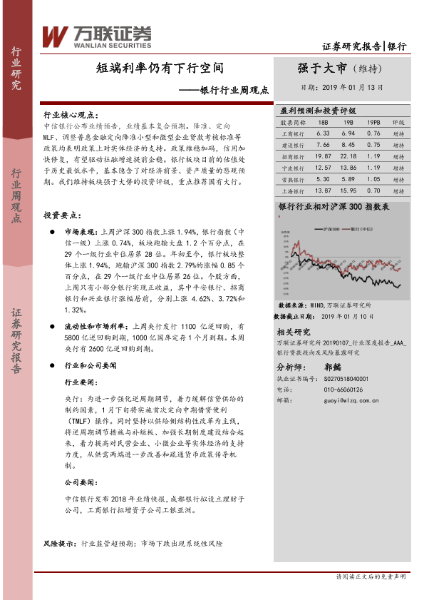 【万联证券】【20190113】银行行业周观点:短端利率仍有下行空间-11页