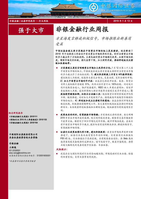 【中银证券】【20190113】非银金融行业周报:方星海发言释放积极信号,市场推陈出新券商受益-12页