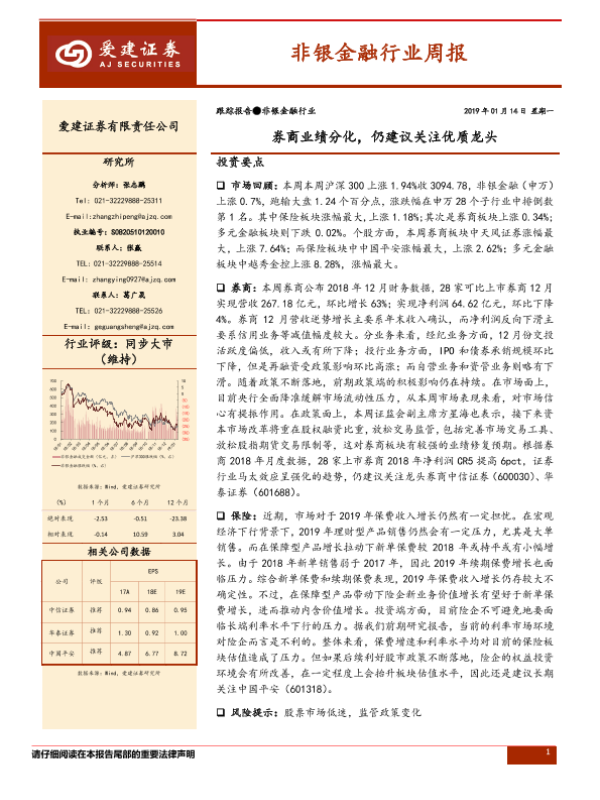 【爱建证券】【20190114】非银金融行业周报:券商业绩分化,仍建议关注优质龙头-13页