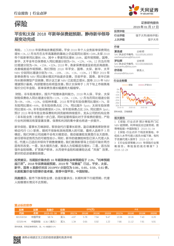 【天风证券】【20190117】平安和太保2018年新单保费超预期,静待新华领导层变动完成-5页