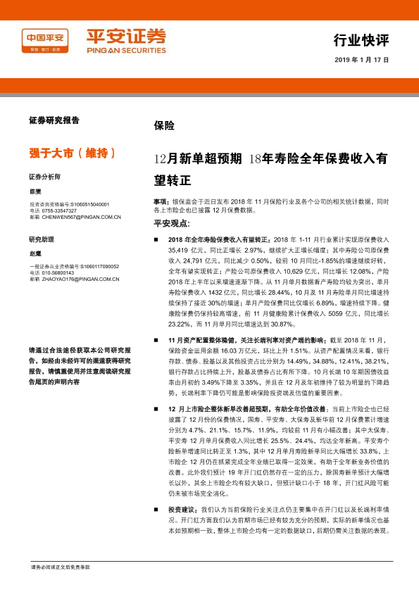 【平安证券】【20190117】12月新单超预期 18年寿险全年保费收入有望转正-6页