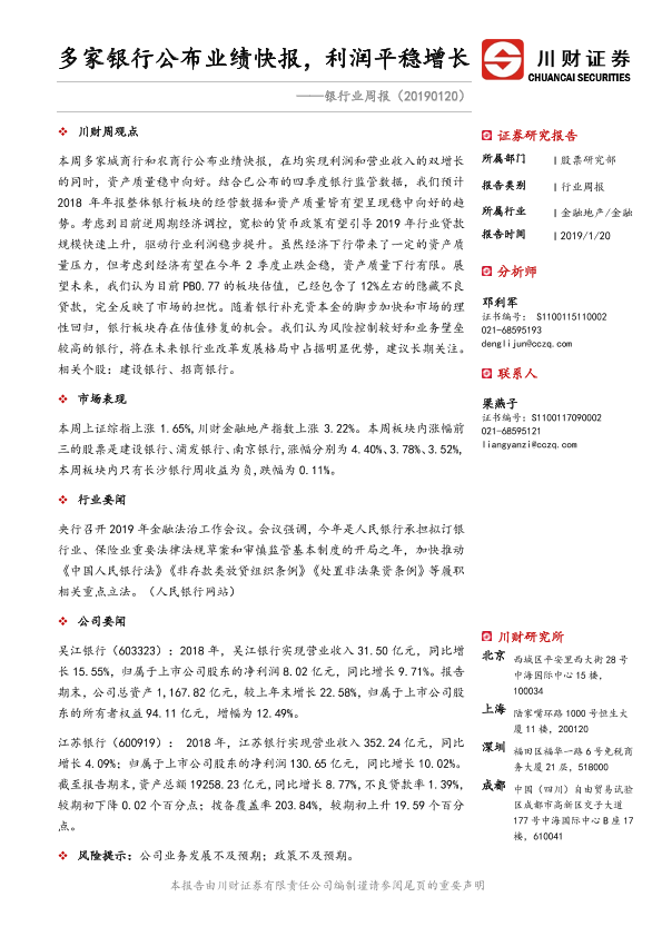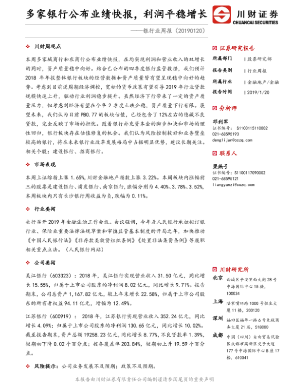 【川财证券】【20190120】银行业周报:多家银行公布业绩快报,利润平稳增长-12页