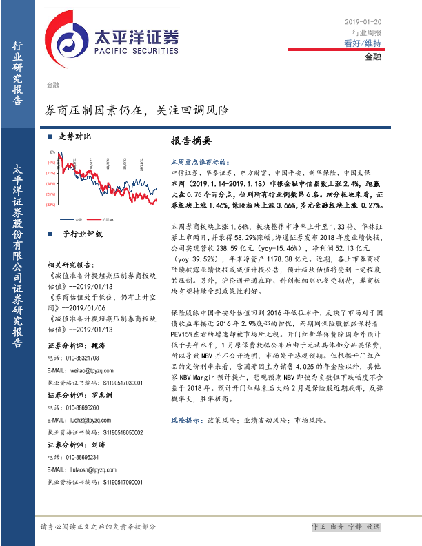 【太平洋证券】【20190120】金融行业周报:券商压制因素仍在,关注回调风险-15页