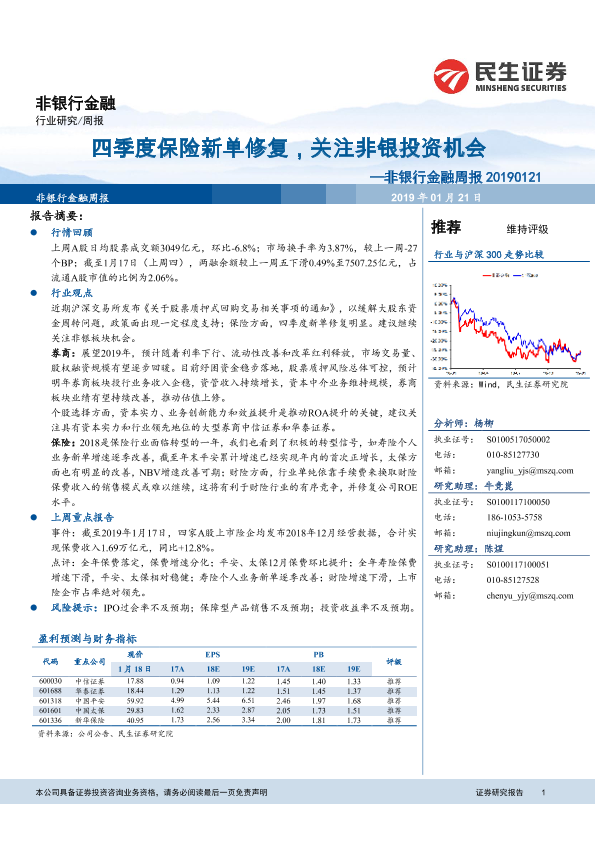 【民生证券】【20190121】四季度保险新单修复,关注非银投资机会-13页