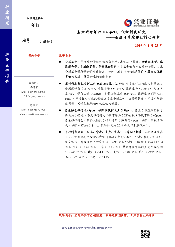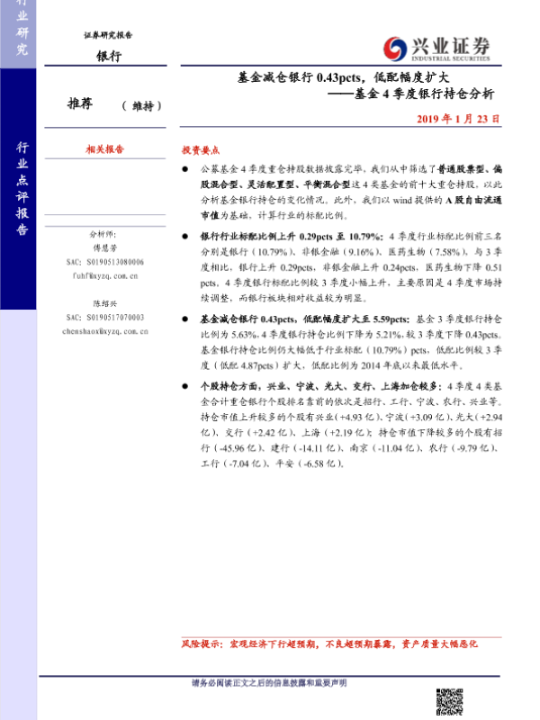 【兴业证券】【20190123】基金4季度银行持仓分析:基金减仓银行0.43pcts,低配幅度扩大-7页