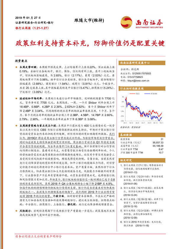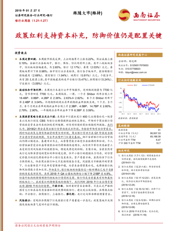 【西南证券】【20190127】银行业周报:政策红利支持资本补充,防御价值仍是配置关键-13页