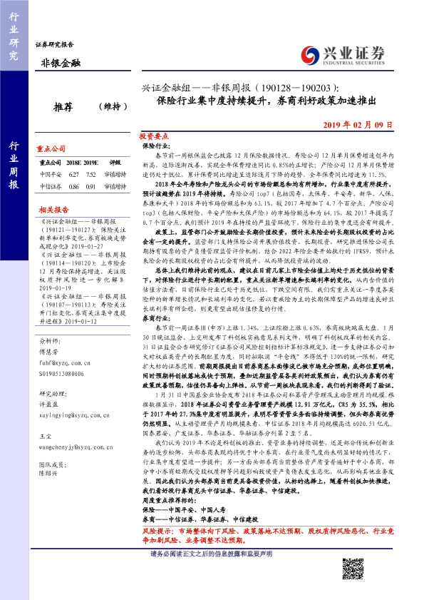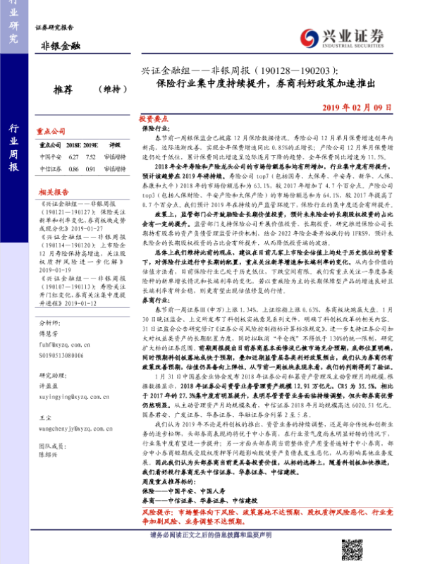 【兴业证券】【20190209】非银周报:保险行业集中度持续提升,券商利好政策加速推出-12页