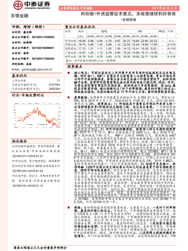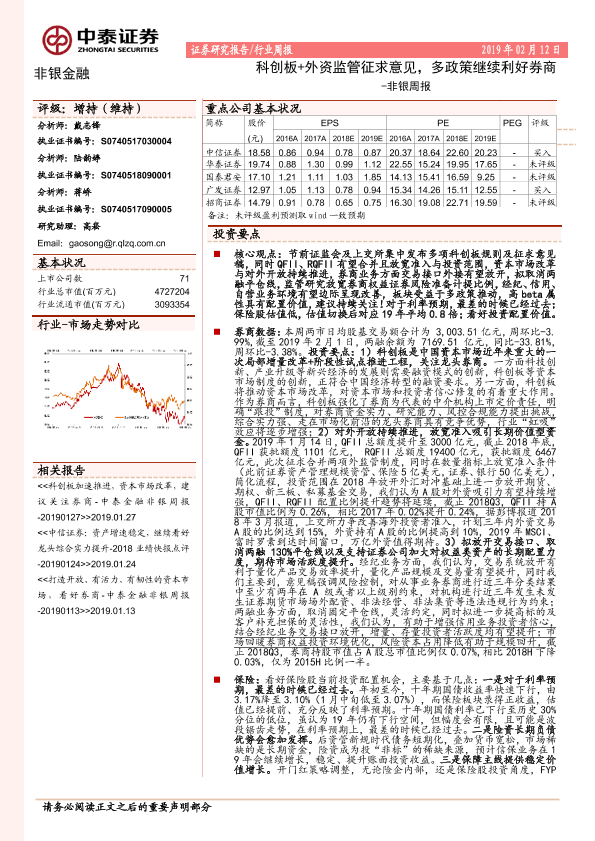 【中泰证券】【20190212】非银周报:科创板+外资监管征求意见,多政策继续利好券商-19页