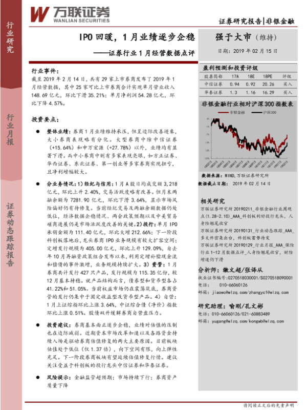 【万联证券】【20190215】证券行业1月经营数据点评:IPO回暖,1月业绩逐步企稳-8页