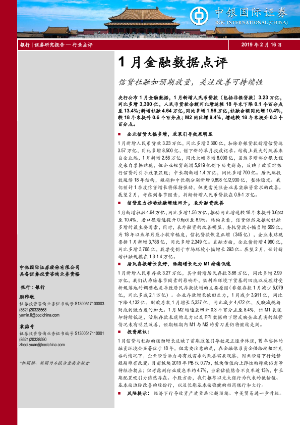 【中银证券】【20190216】1月金融数据点评:信贷社融如预期放量,关注改善可持续性-6页