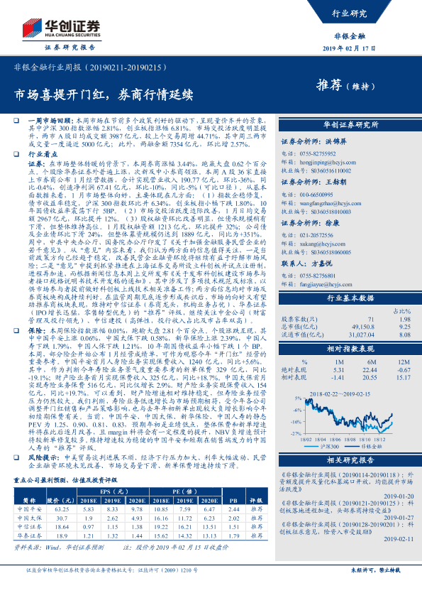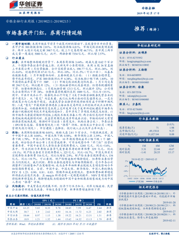 【华创证券】【20190217】非银金融行业周报:市场喜提开门红,券商行情延续-16页