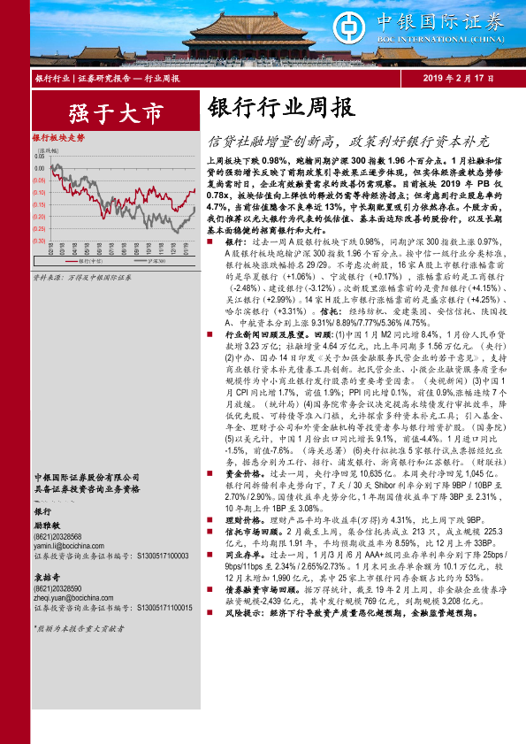 【中银证券】【20190217】信贷社融增量创新高,政策利好银行资本补充-19页