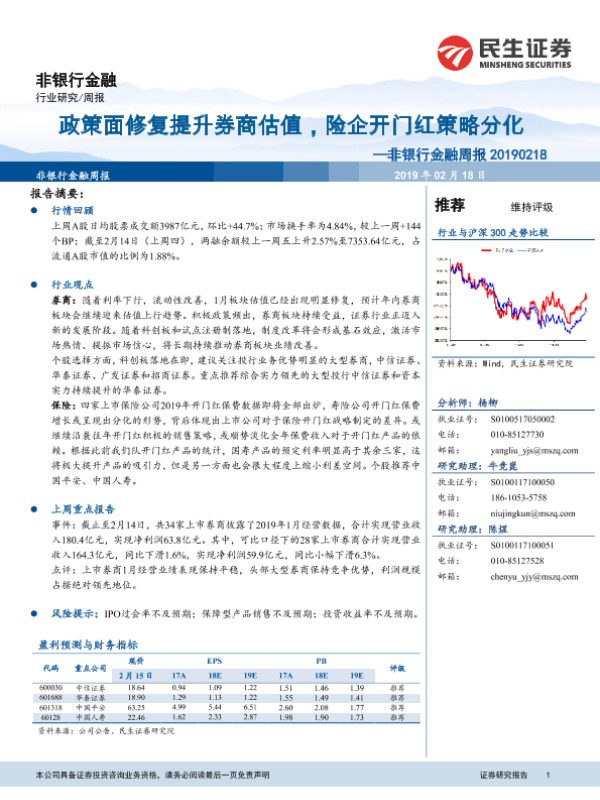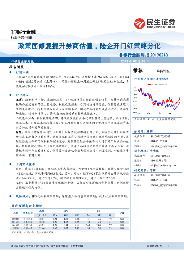 【民生证券】【20190218】非银行金融周报:政策面修复提升券商估值,险企开门红策略分化-12页