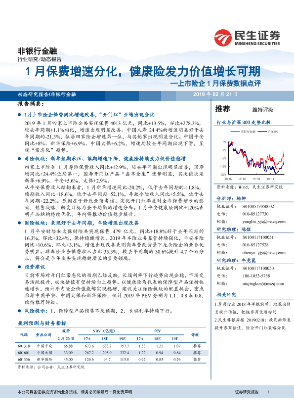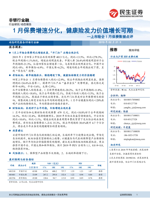 【民生证券】【20190221】1月保费增速分化,健康险发力价值增长可期——上市险企1月保费数据点评-9页
