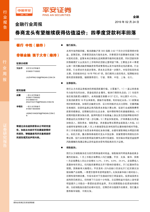 【平安证券】【20190224】金融行业周报:券商龙头有望继续获得估值溢价;四季度贷款利率回落-9页