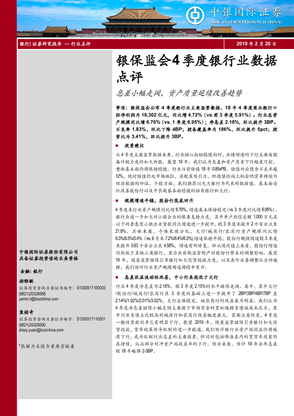 【中银证券】【20190226】银保监会4季度银行业数据点评:息差小幅走阔,资产质量延续改善趋势-6页