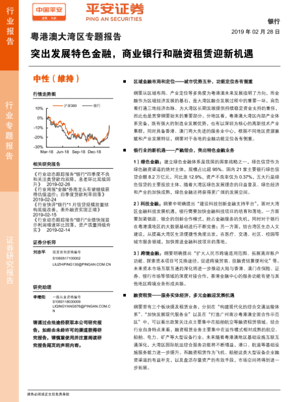 【平安证券】【20190228】银行:粤港澳大湾区专题报告-突出发展特色金融,商业银行和融资租赁迎新机遇-18页