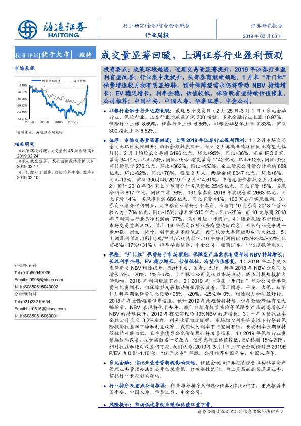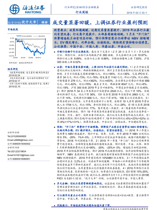 【海通证券】【20190303】综合金融服务行业周报:成交量显著回暖,上调证券行业盈利预测-17页