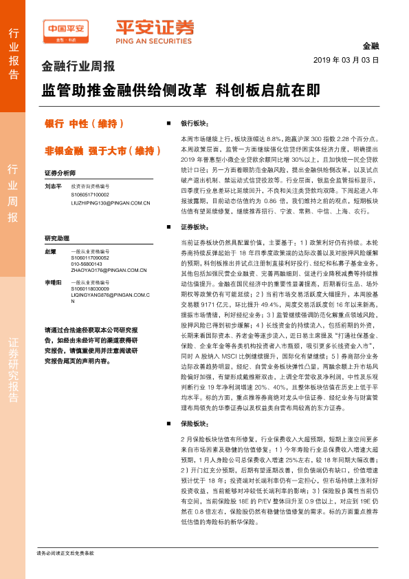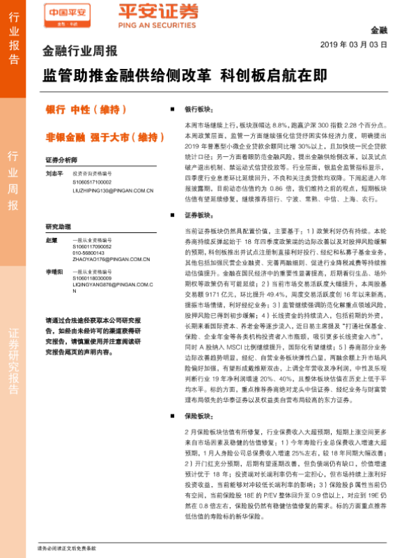 【平安证券】【20190303】金融行业周报:监管助推金融供给侧改革 科创板启航在即-9页